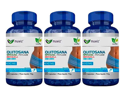 DESCRIÇÃO: QUITOSANA – 600mg / 120 cápsulas. Possui Spirulina, Psyllium, Beringela, vitamina B1 e Cromo. Uso diário.